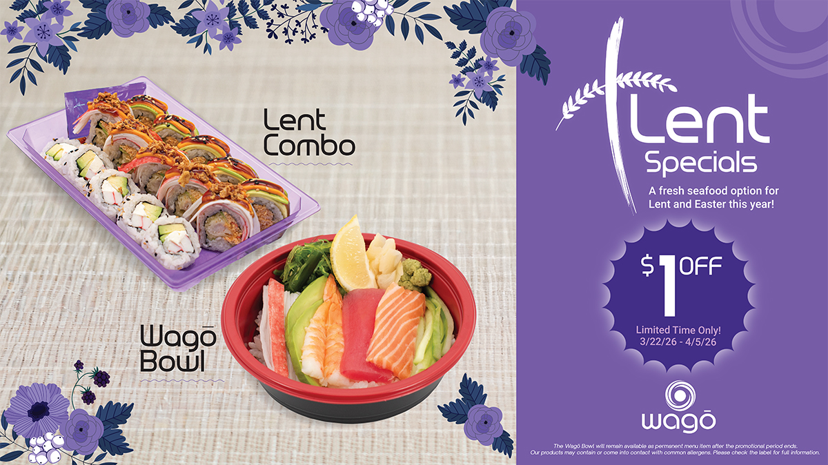 Enjoy fresh seafood options for Lent and Easter this year! For a limited time, save $1 on our Lent Combo and Wagō Bowl, and even after the promotion ends, the Wagō Bowl will remain available as a permanent menu item.